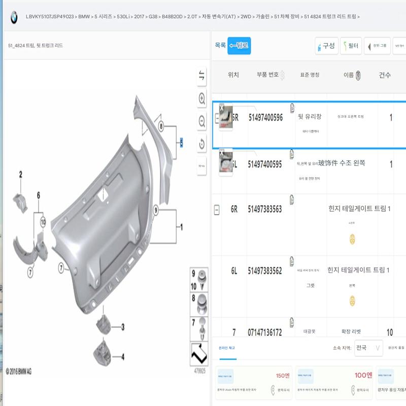 BMW G38 테일커버 워터채널 518 트렁크 워터가이드 플레이트 520 525 테일라이트 방수고무 스트립 트림 530