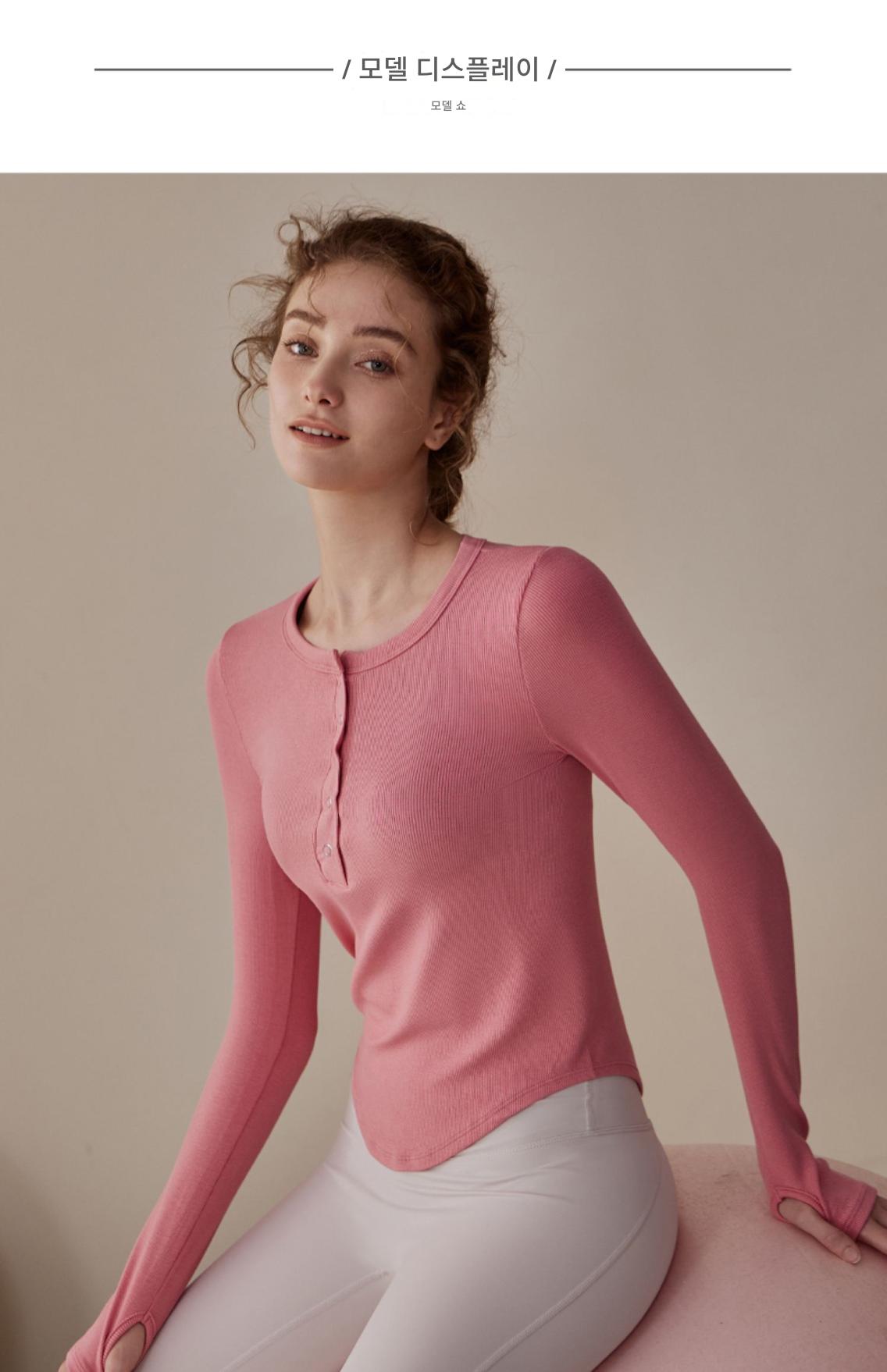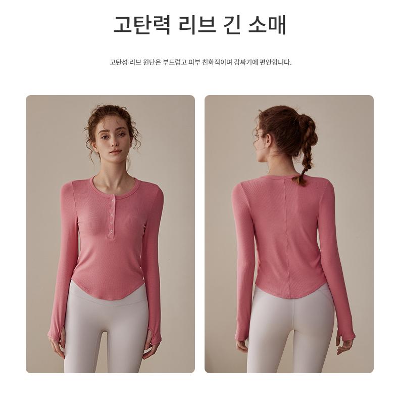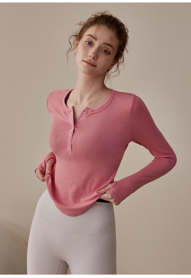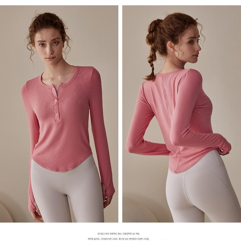 Bylure 필라테스 트레이닝복 가을 겨울 여성용 신축성 리브 단추 피트니스 긴팔 티셔츠 핑크 요가 상의