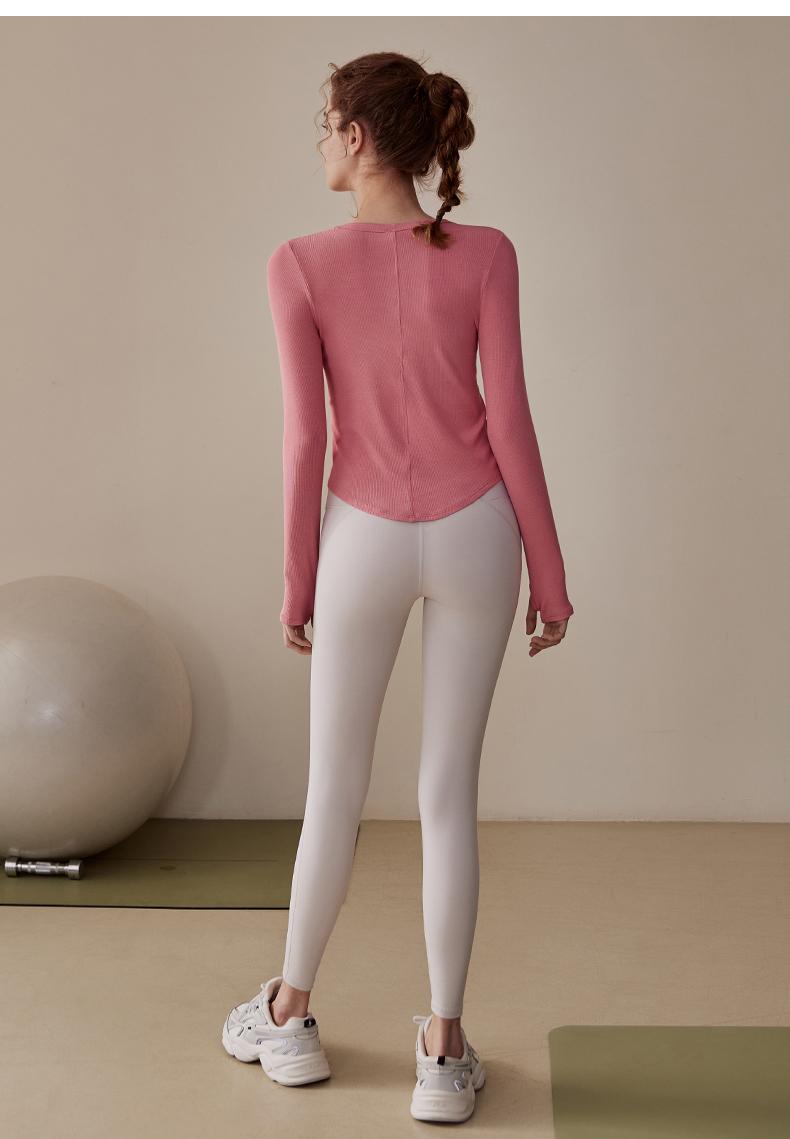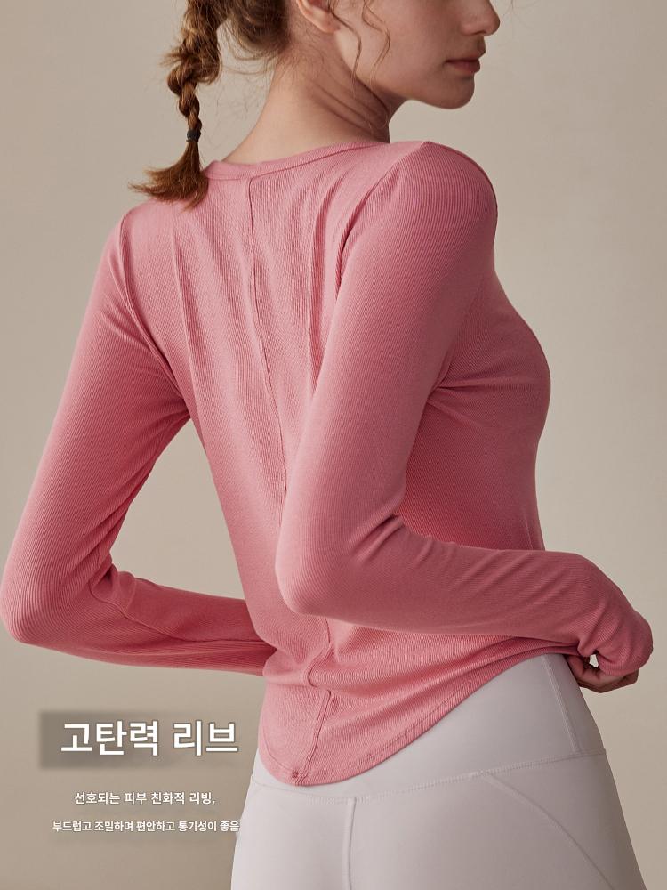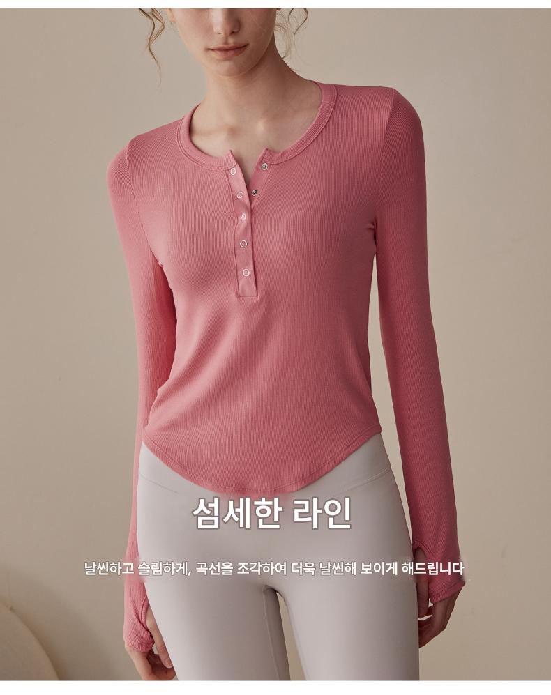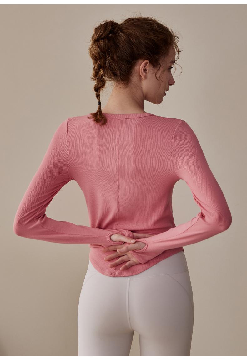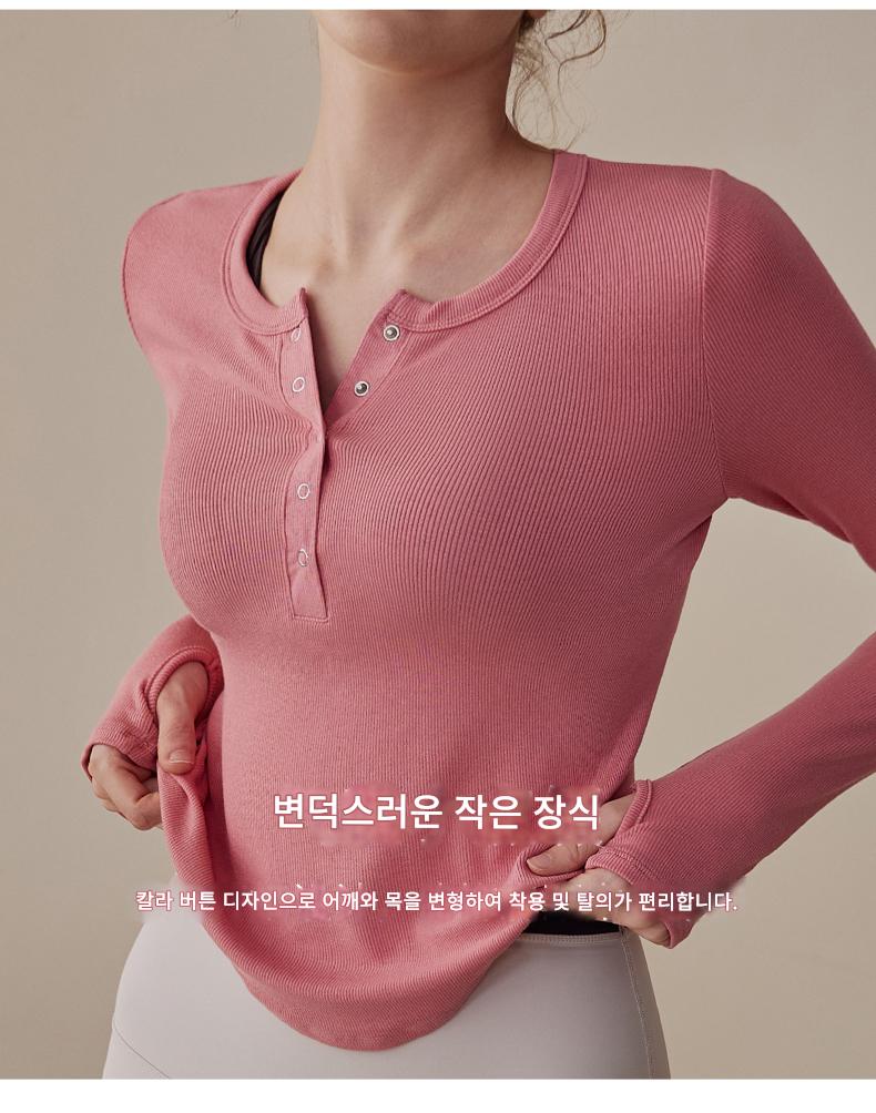 Bylure 필라테스 트레이닝복 가을 겨울 여성용 신축성 리브 단추 피트니스 긴팔 티셔츠 핑크 요가 상의