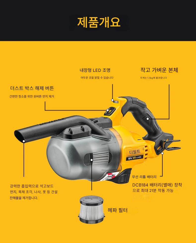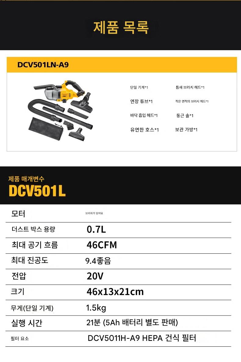 DEWALT DCV501LN 20V 리튬 배터리 휴대용 차량 장착 산업용 먼지 제거 잔해물