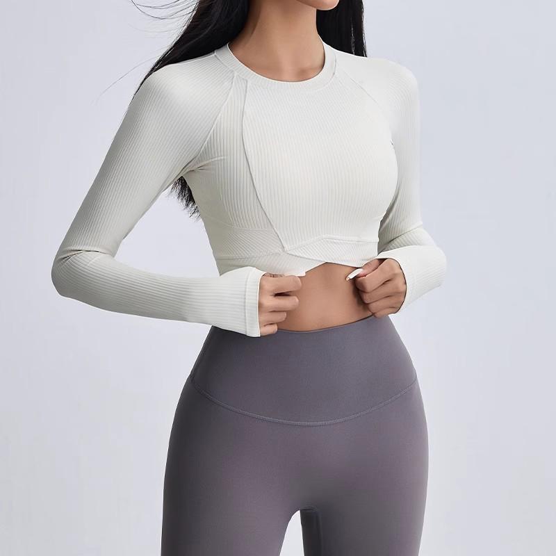 KAYANTY 가을과 겨울 라글런 슬리브, 스레디드 롱 슬리브, 요가복, 여성용 크로스 헴 피트니스복, 러닝 스포츠 상의