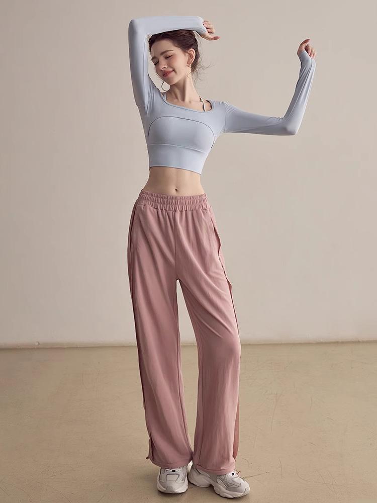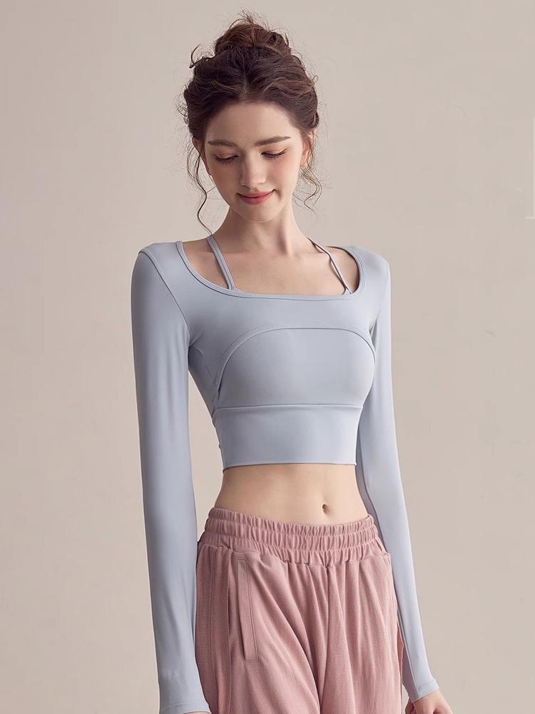 KAYANTY 여성용 고급 요가 상의 가슴 패드가 있는 가짜 2피스 피트니스 긴팔 홀터넥 요가복 짧은 새 상품