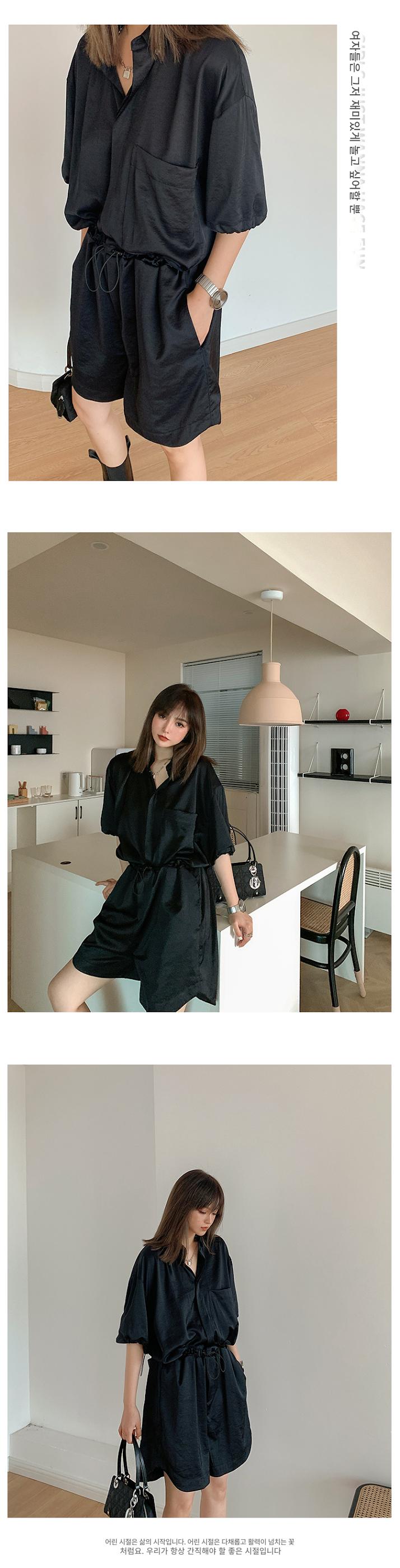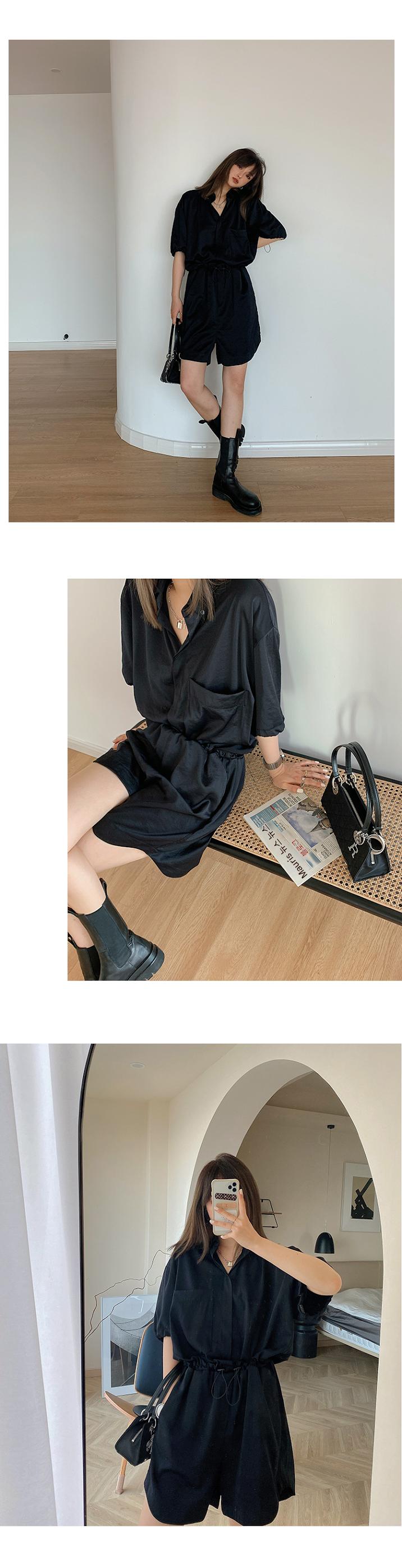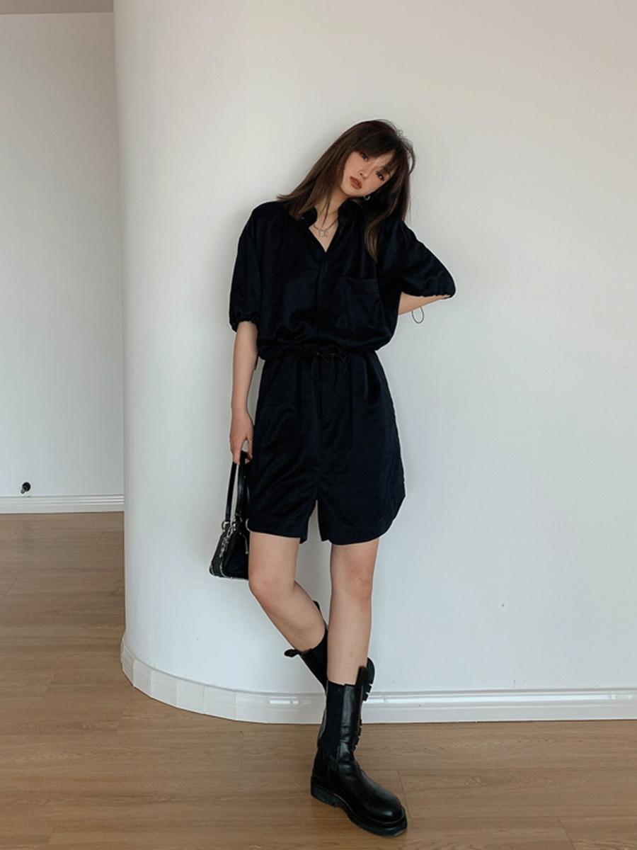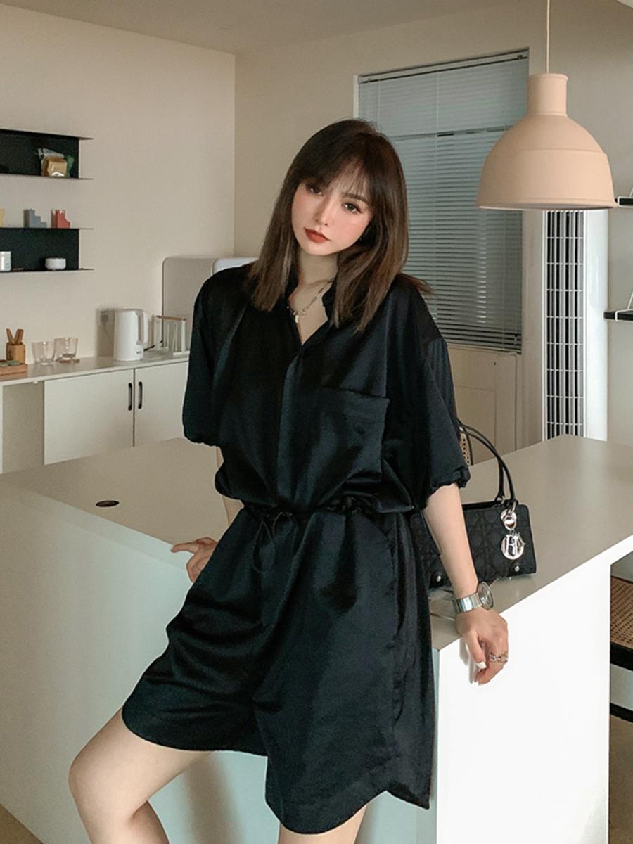 MOERSHOP 하이콜드 레이디 광감각 새틴 블랙 점프수트 루즈 웨이스트 슬림 반바지 여성 여름