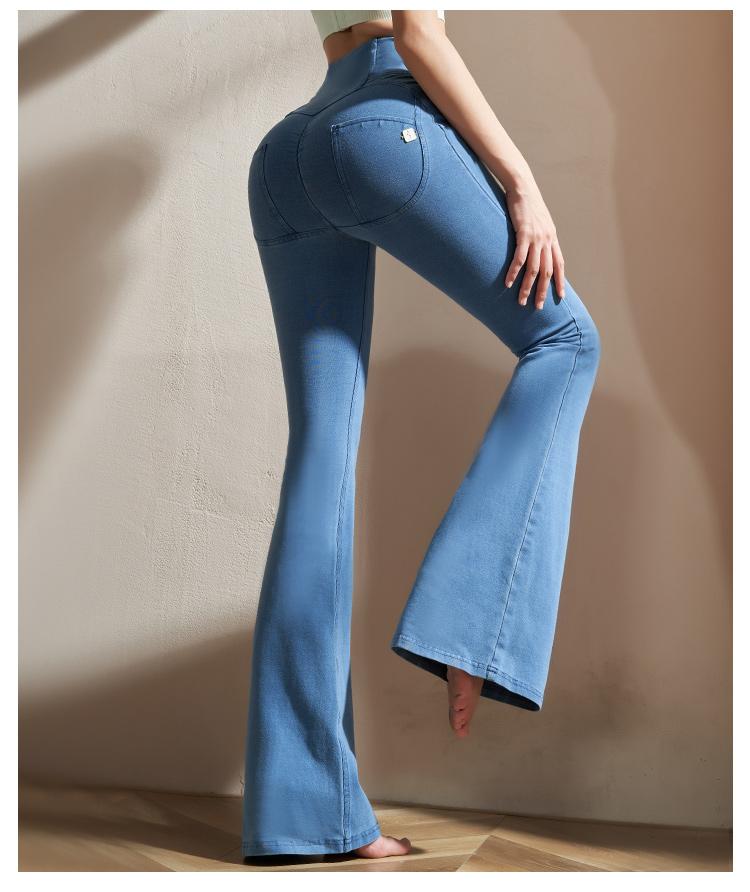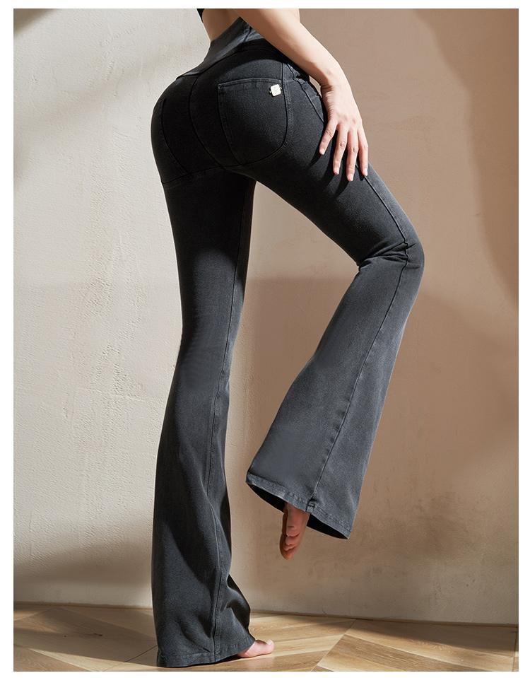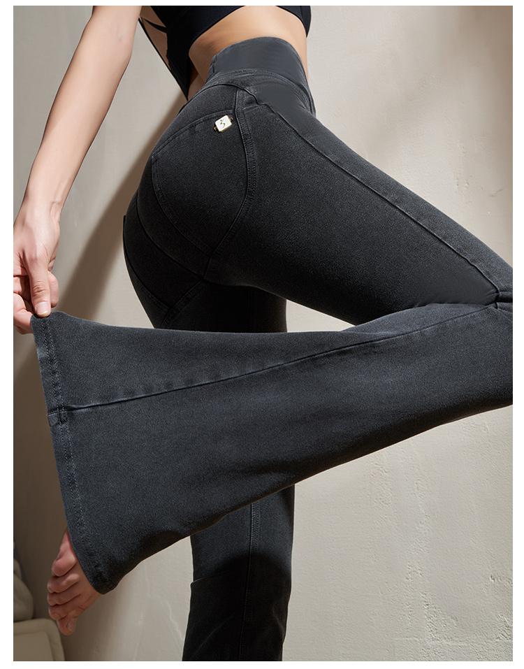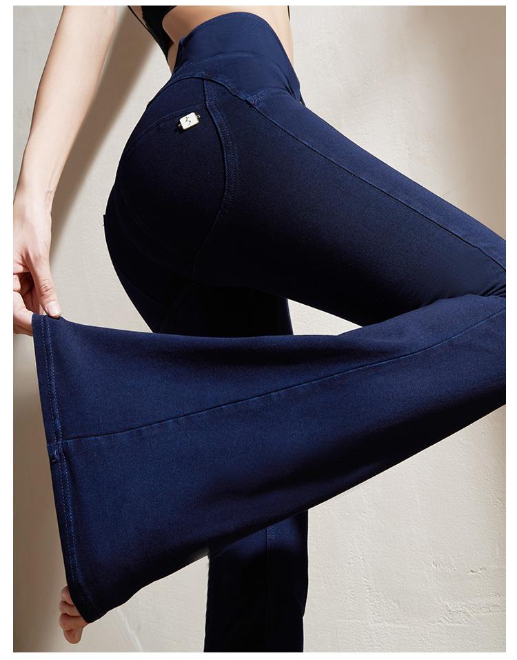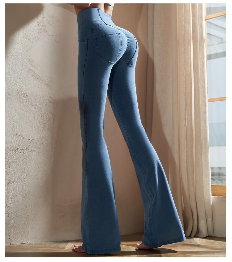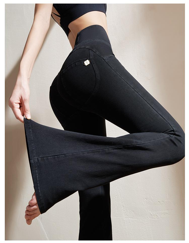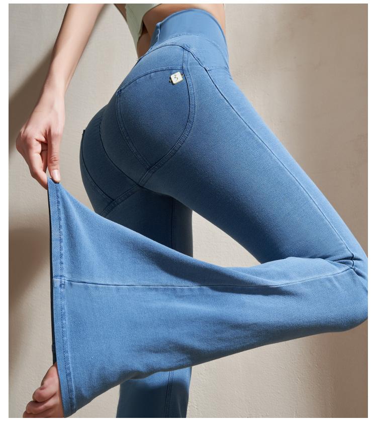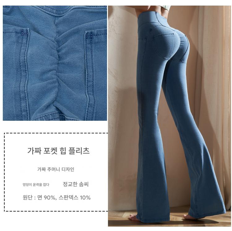 Youyoumeat 데님 피치 힙 마이크로 플레어 요가 팬츠 아웃도어용 하이웨이스트 힙 리프팅 피트니스 팬츠 속건 스포츠 팬츠 여성용