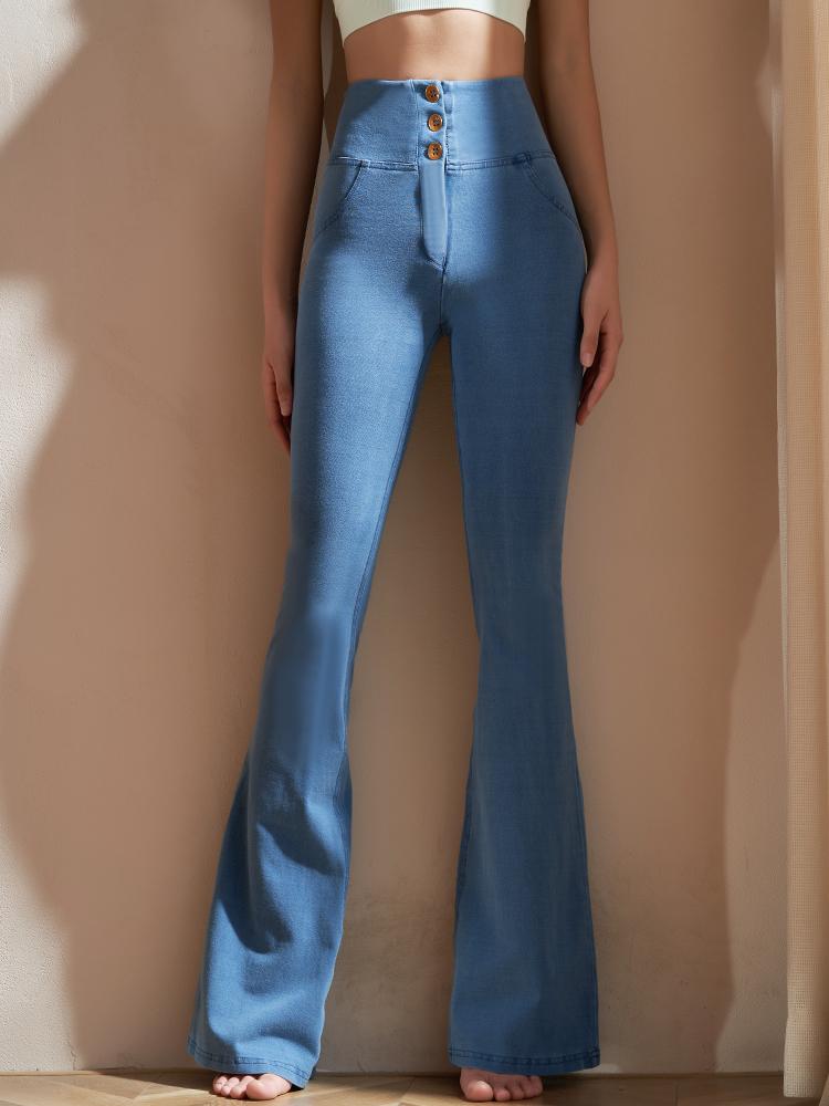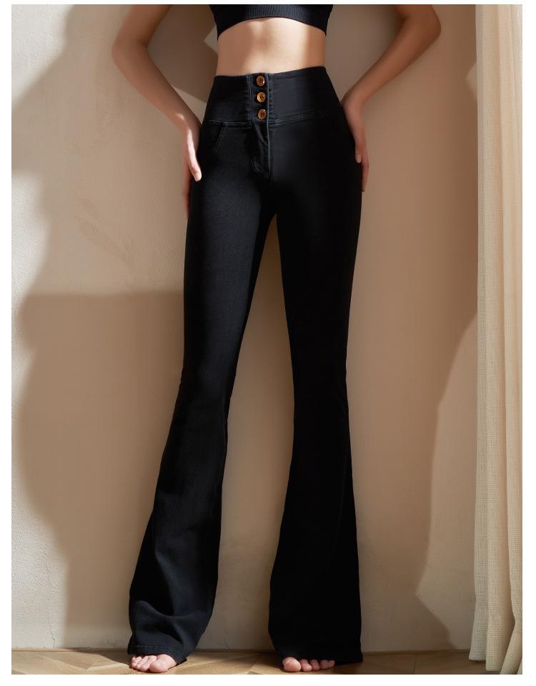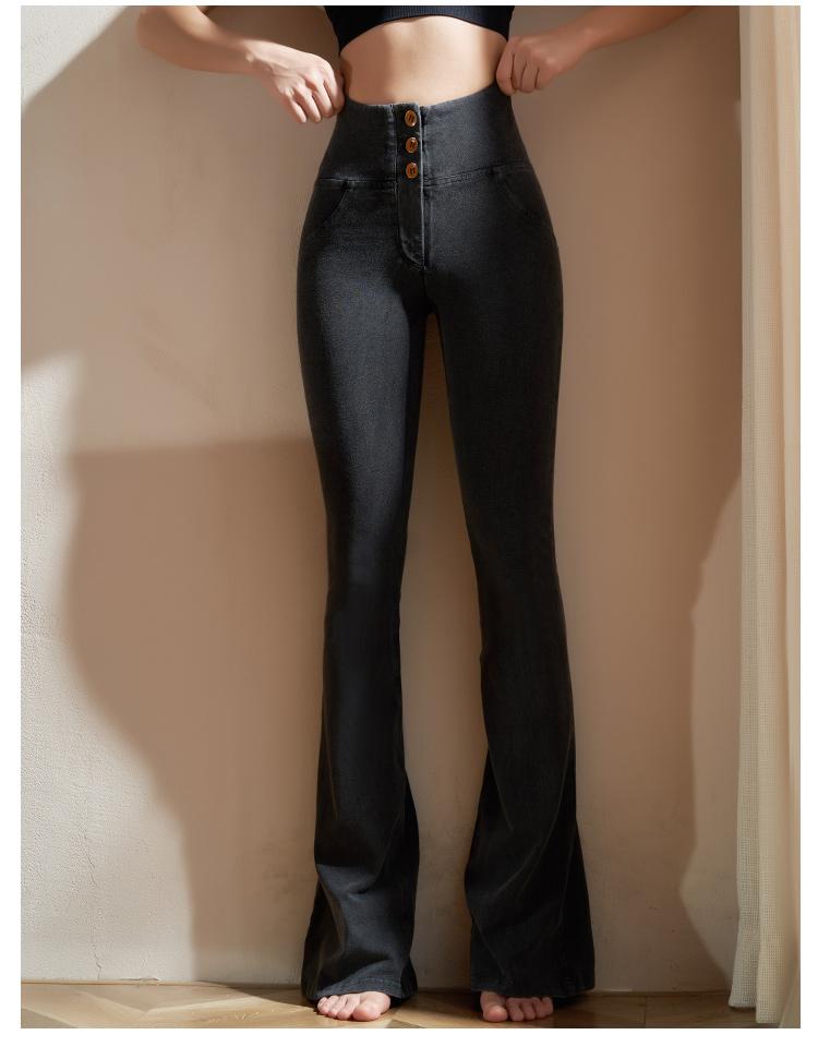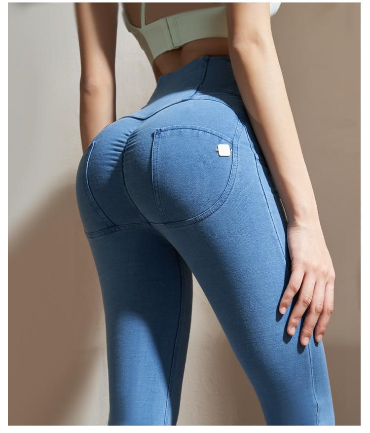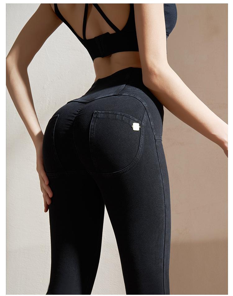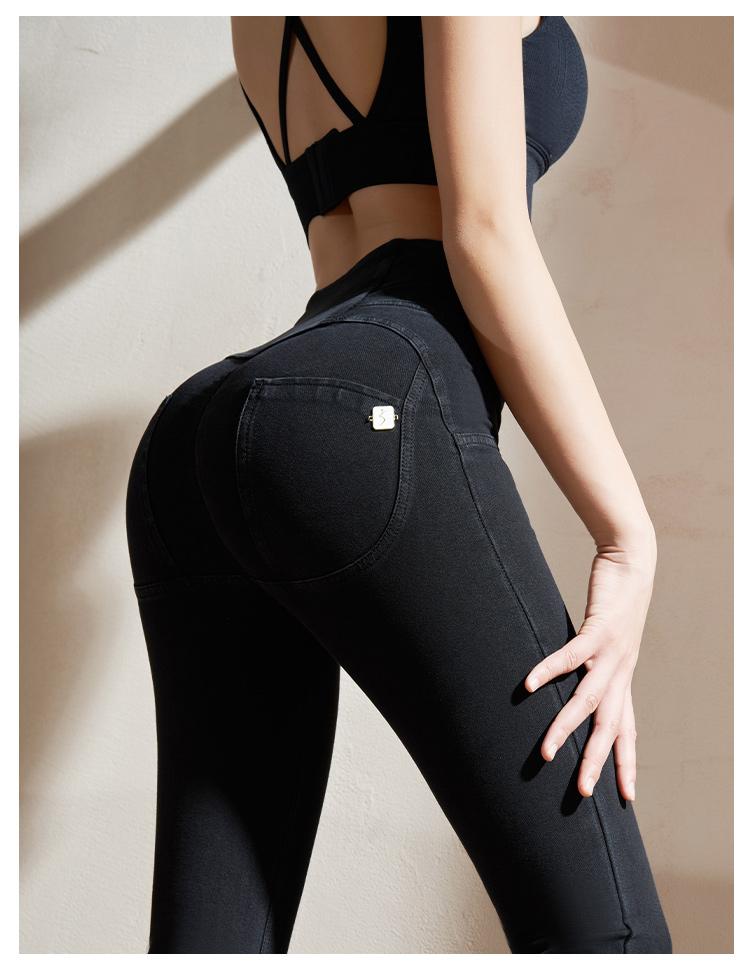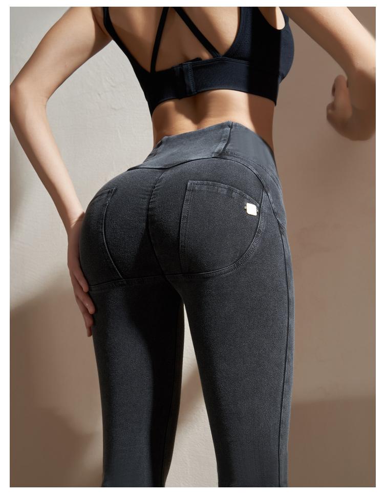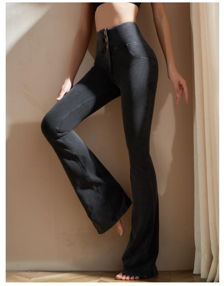 Youyoumeat 데님 피치 힙 마이크로 플레어 요가 팬츠 아웃도어용 하이웨이스트 힙 리프팅 피트니스 팬츠 속건 스포츠 팬츠 여성용