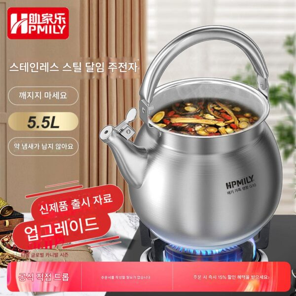 316 스테인리스 스틸로 제작된 전통 중국 약초 달인 냄비로, 물을 끓이고 약초를 달이는 데 사용하며, 휘파람이 달려 있어 가정용과 직화 사용에 적합하며, 특히 노인에게 적합합니다.